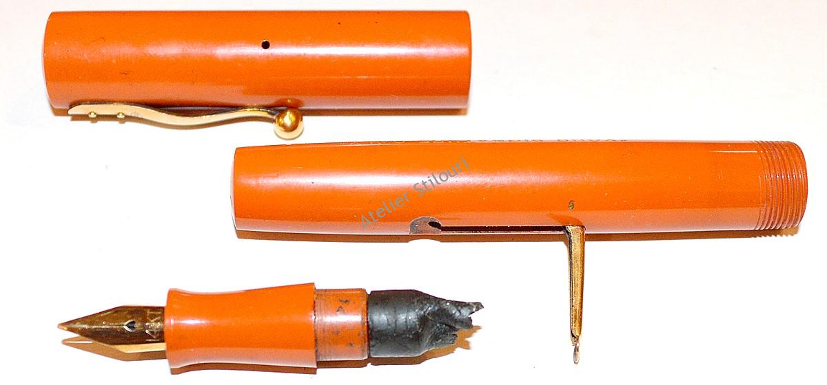 Stiloul este unul relativ redus in dimensiuni, ebonita orange, incarcare levier, penita Alco 14kt super flexibila, in stare excelenta. Venit pentru revizie generala, schimbare sac intern.