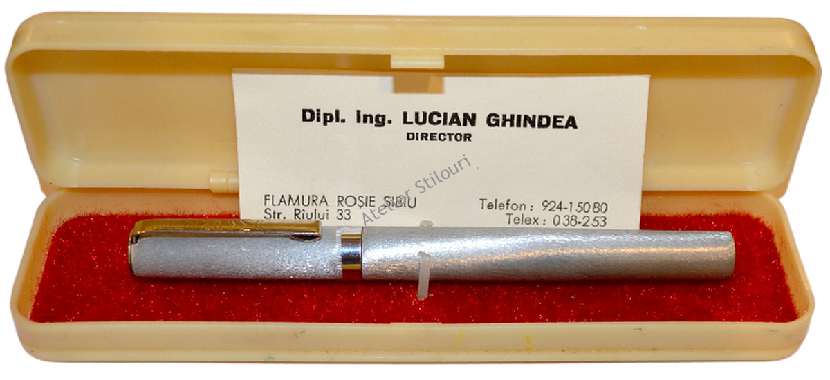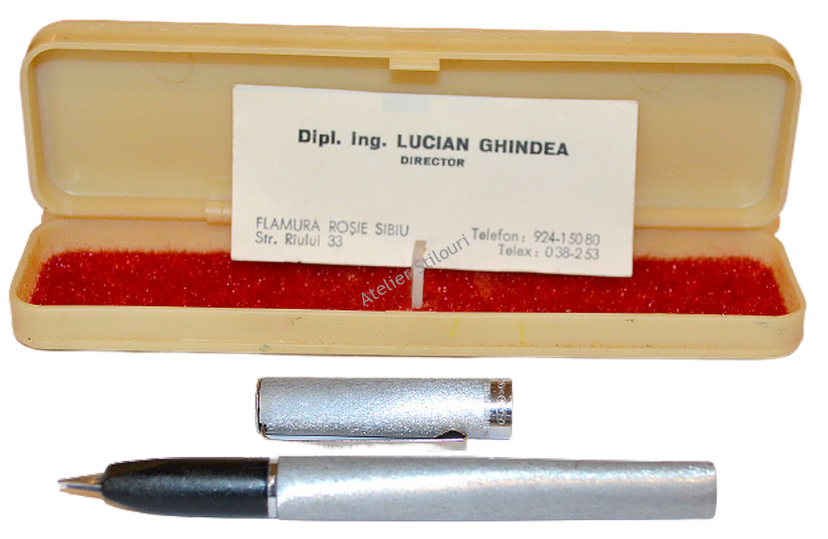 In etuiul de plastic, produs la Flaro Sibiu, model anii 80's, am gasit un stilou Flaro Selena M, insotit de o carte de vizita. Stiloul in sine nu este foarte rar, insa povestea sa cred ca merita a fi spusa. Nu intalnesc des stilouri cu o istorie in spate, si este extrem de incitant cand poti spune unor pasionati despre calatoria in timp a unui obiect fabricat cu 40+ de ani in urma.