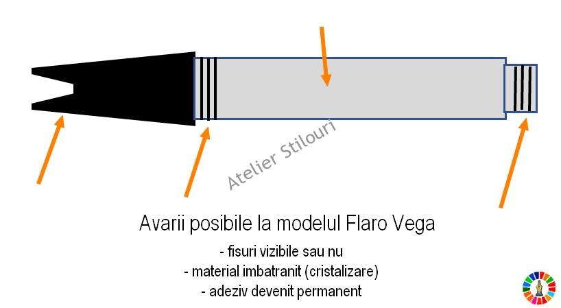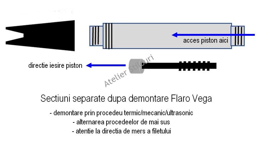 La demontare, va sugerez sa acordati atentie deosebita pieselor si portiunilor din stilou care pot fi deja avariate, fisurate invizibil, friabile: jumatatea de sus (spre penita) a sectiunii acesteia, corpul rezervor, mai ales in zona unde axul pistonului iese din corp, axul elicoidal propriu-zis (la imbinarea cu garnitura). Am observat ca partea care rezista cel mai bine la un stilou vechi Flaro este garnitura, care fiind din plastic siliconic, nu este solicitata peste masura.