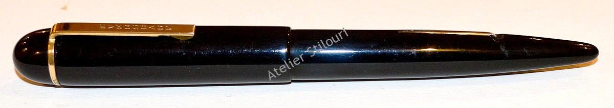 Modelul Eversharp Skyline a fost prezentat publicului in 1941, dupa o campanie de publicitate intensa, in trei dimensiuni: Standard, Executive si Demi. Stiloul de aici este model demi, penita F 14kt din noul design Eversharp (deja nu mai erau folosite vechile penite Wahl, instalate pe stilourile din prima generatie). Era ces mai ieftina varianta, cu clipul fara "coama" (clipul se oprea la marginea top cap-ului, fara a continua peste acesta), si fara inel decorativ pe capac. Evident, in prezent stilourile din serie, indiferent de model, sunt colectibile, desi un pret premium il iau modelel cu capacul striped, sau cele gold rolled, sau design deosebit.