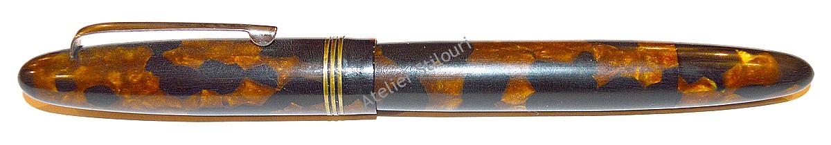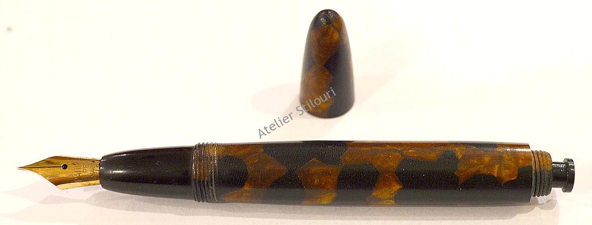 29/07/2022Stilou produs in Franta, cca 1930, marcat "INTRÉPIDE", in stare excelenta cosmetic si mecanic. Stiloul a fost produs din caseina (corp si capac), cu sectiunea penitei si butonul din plastic de baza (unul din primii polimeri). Sistemul de incarcare este unul cu buton, lama interna si sac.