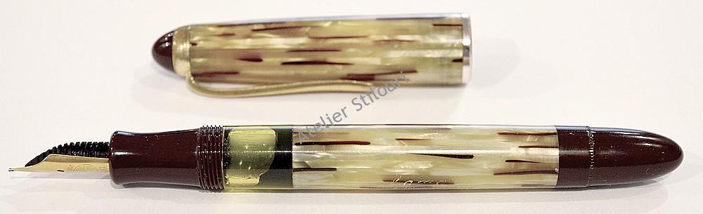 15/12/2022Stilou marcat Lamar, produs in anii 60 in Germania, modelul light tortoise, cu accente burgundy. Rupt in doua la cupla corpului transparent in rezervor, cu detasare totala. Curatare, sudura, aisgurare etanseitate rezervor si garnitura piston.