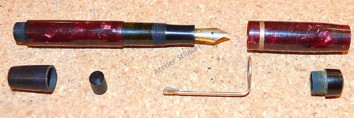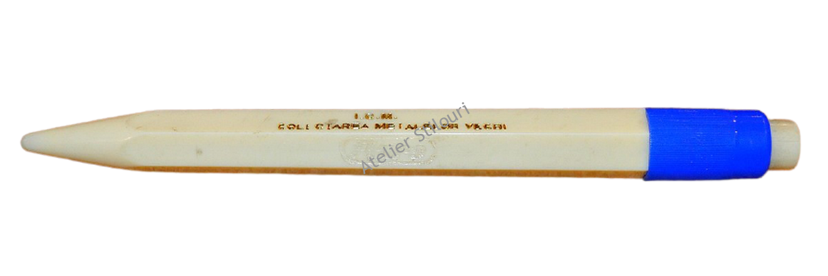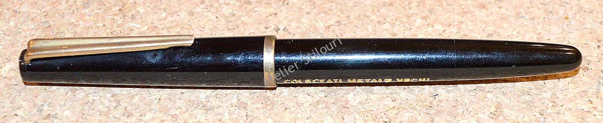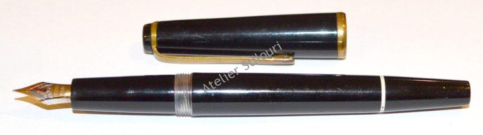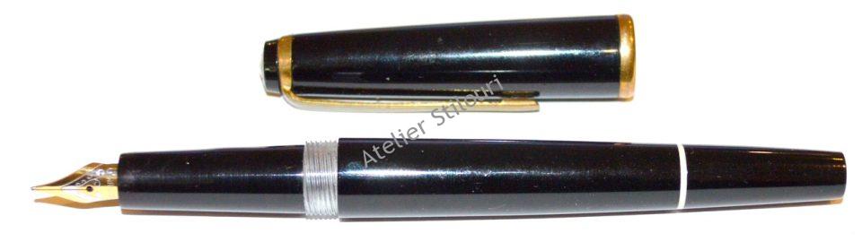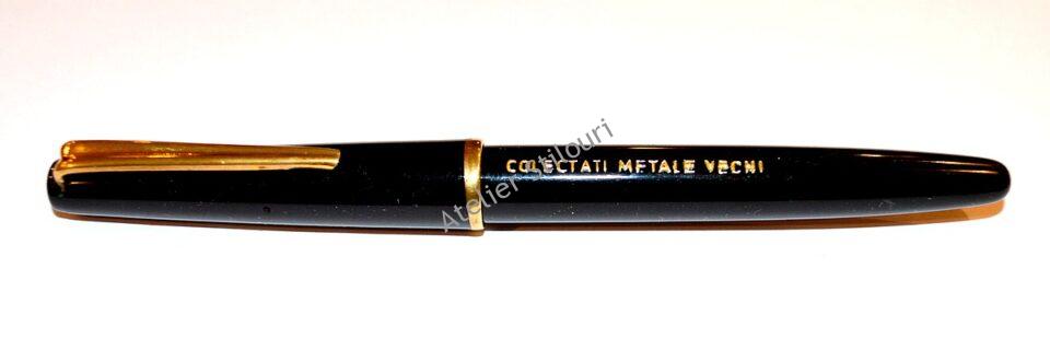 08/05/2021Stilou romanesc, produs la MACO Sibiu, plastic dur din primele retete dezvoltate la Sibiu. Mecanism cu piston mascat (tip de piston care este ascuns sub corp, cu buton aparent si capac fals, in realitate nefiind un piston in sensul clasic). Mecanismul poate fi vazut ca fiind similar cu cel de pe mai multe modele produse la Archimet, de ex. ACM Terra Mk1. Fereastra de cerneala fatetata in nuanta de ambra, furnituri alama, penita germana anii 50-60. De remarcat capacul fals al pistonului, care este mai lung decat de obicei la modelele produse la Archimet.
