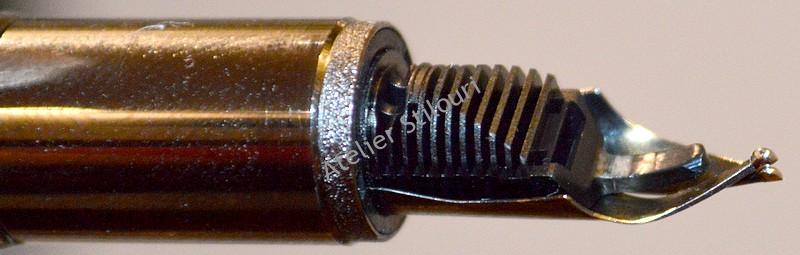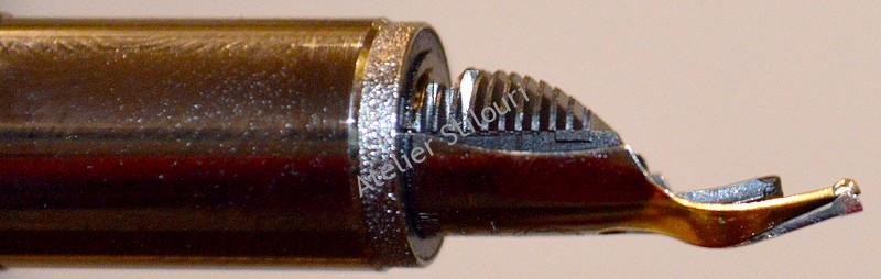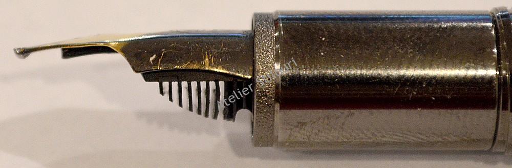OK, penita a fost indreptata, si nu fost usor, fiind afectata pe ambele axe, longitudinal si transversal. Pastilele au fost aliniate, cu burnish pe revers. Geometric, penita este refacuta, insa nu e gata nici pe departe. Urmeaza verificarea (si ajustarea) debitului, contactul cu hartia, reslefuirea pastilelor pentru a se plia pe noua configuratie. Asadar, mai e destul pana departe.