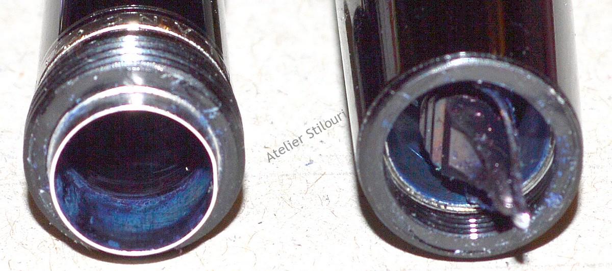 28/02/2022Un Montblanc Boheme, venit complet rupt, cu separatie intre corp si sectiunea penitei. Sistemul elicoidal este si el afectat, cu infundare feed, pin port-cartus deformat.
