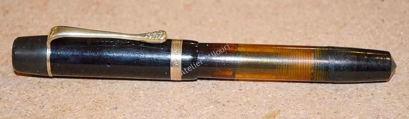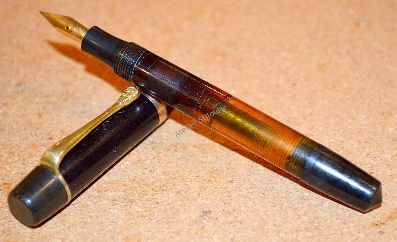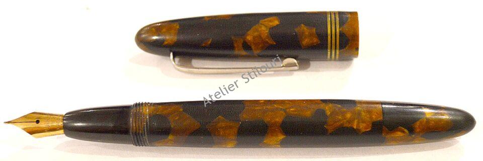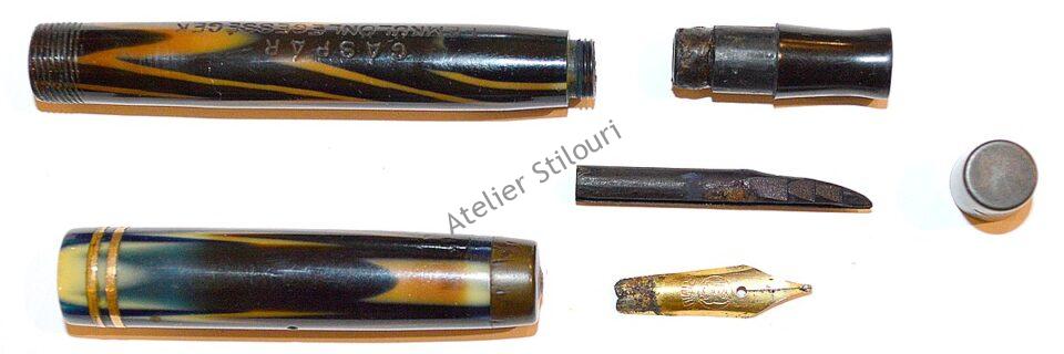 11/12/2019Un stilou fabricat in anii de sfarsit 20’s / inceputul anilor 30’s. Marcat pe capac National Solid, gravura termica. Materialul corpului este celuloid portocaliu, restul stiloului (capac fals, capac, sectiune penita) din ebonita, la fel si feedul. Incarcare prin piston / buton static, capacitate sub 1ml cerneala. Desi stiloul este marcat ca fiind National, corpul nu mai pastreaza nici o inscriptie, asa ca e posibil sa fie fabricat de altcineva pentru National, la export sau pentru o anumita piata.