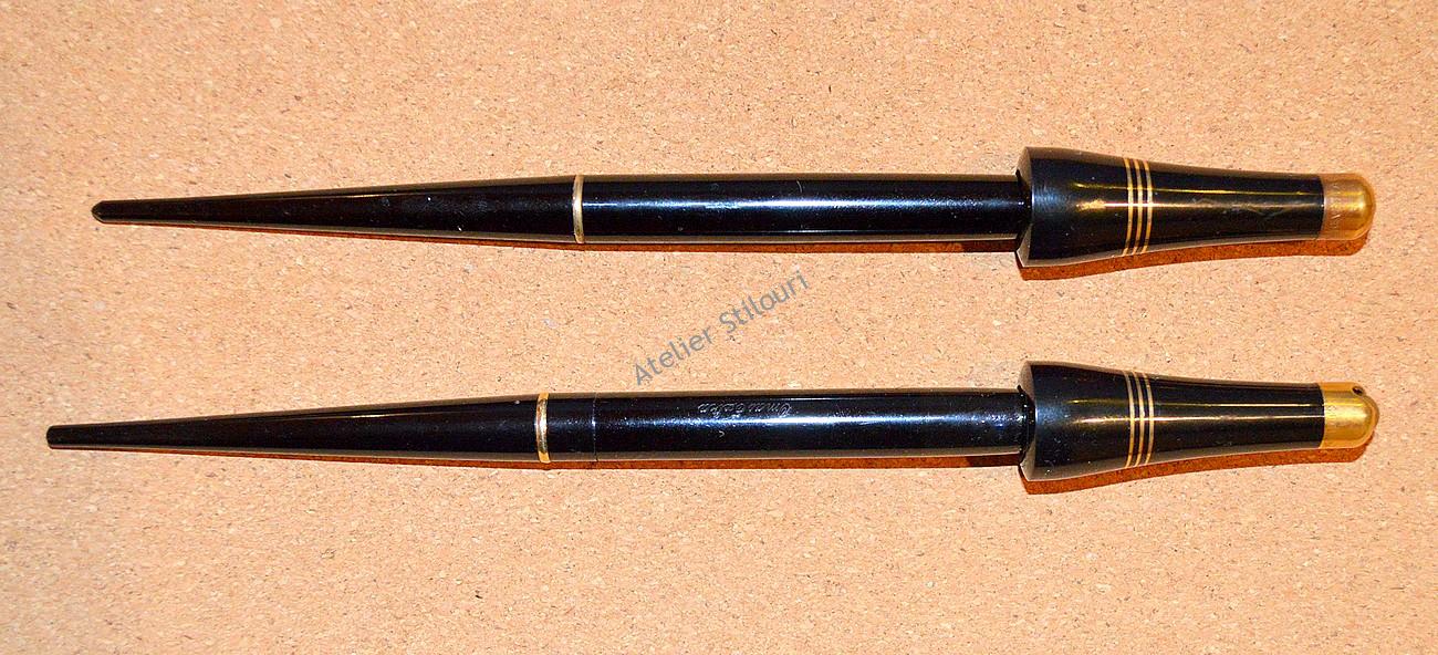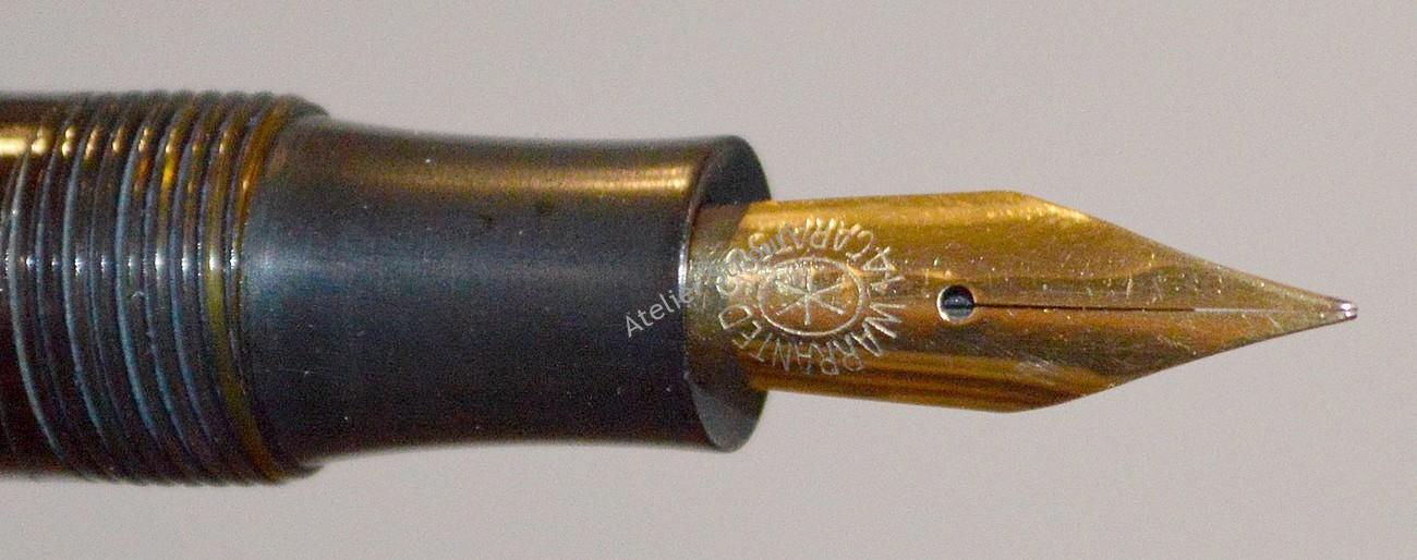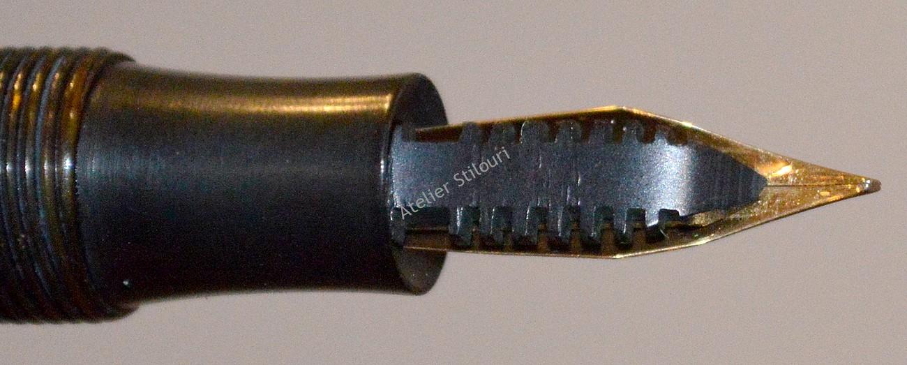 Penita este una necunoscuta, dar stiu ca acest model a fost vazut si pe alte stilouri fabricate in Germania in aceeasi perioada, instalat pe modele de stilouri AngloAmer, Dignitar, etc. Aur 14kt, design de perioada (slender), flexibila (2x), linie normala F. Penita si feedul in stare excelenta.