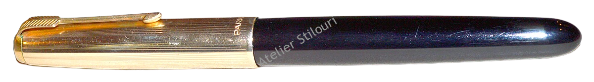 19/03/2022Stilou Parker model 51 Aerometric, productie 1949 (2nd), negru abanos, capac 1/10 - 12kt, penita model 1948, tub metalic protector model din prima generatie (instructiuni complete gravate pe manseta tubului). Venit cu sac rupt, fisura in sectiunea penitei, sistem incarcare complet infundat. Restaurat complet in atelier.