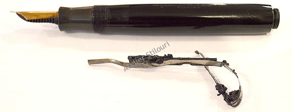 12/02/2023Parker Duofold Sr, black, incarcare buton cu lama tip "A", venit pentru reparatie si revizie. Lama interna este distrusa, sacul complet topit si rupt. Trebuie inlocuite ambele cu unele noi. Butonul este in stare buna si va fi refolosit.