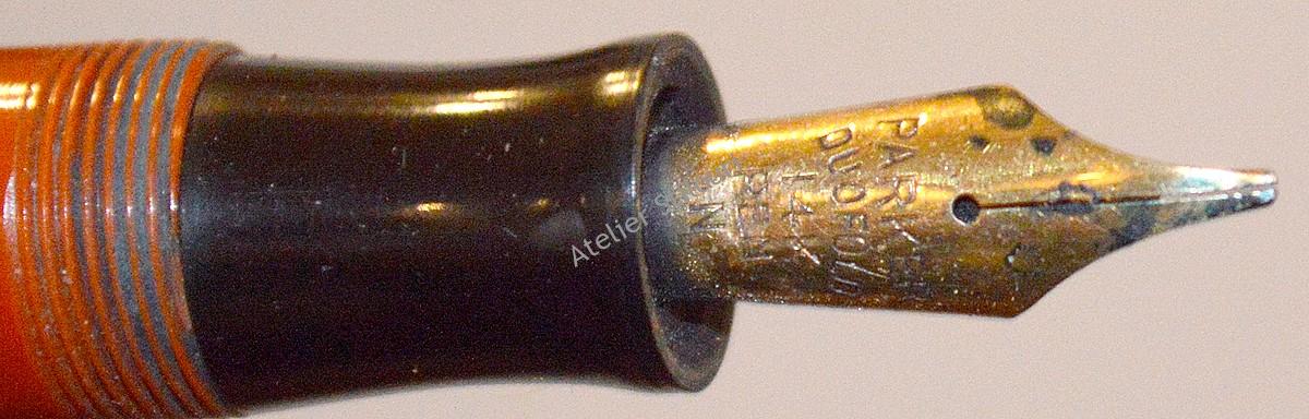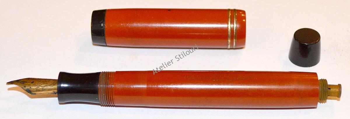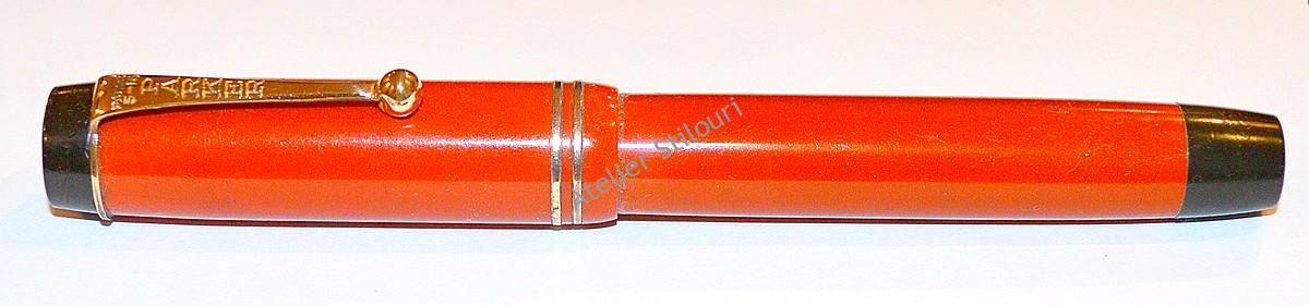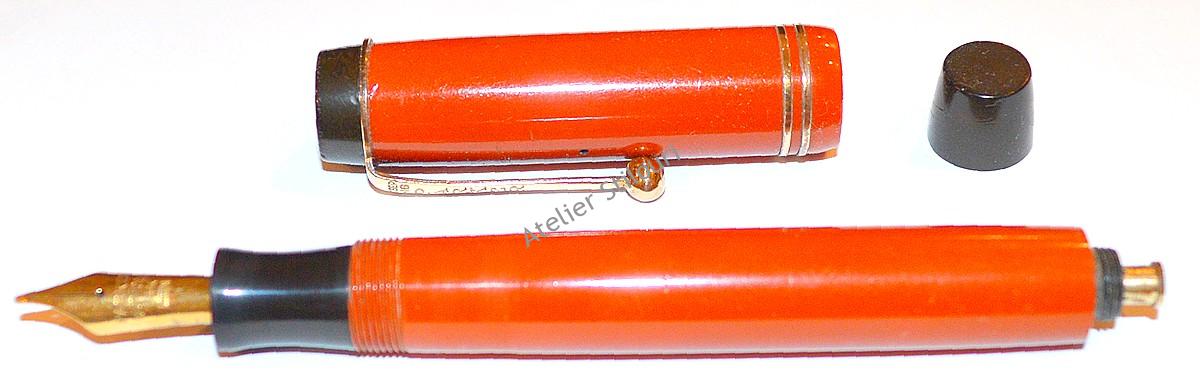 21/01/2021Un excelent model de la Parker, din seria Duofold Senior Streamlined, fabricat intre 1931 - 1933. Gravat "Geo. S. Parker - Parker Dufold - Reg TM" culoarea orange/red, evident mai "obosita" decat la iesirea din fabrica. Incarcare sac interior cu buton, capac fals buton/buton prindere clip si sectiunea penitei din ebonita. Accesorii placate 14kt, inele decorative concurente, design general streamlined.