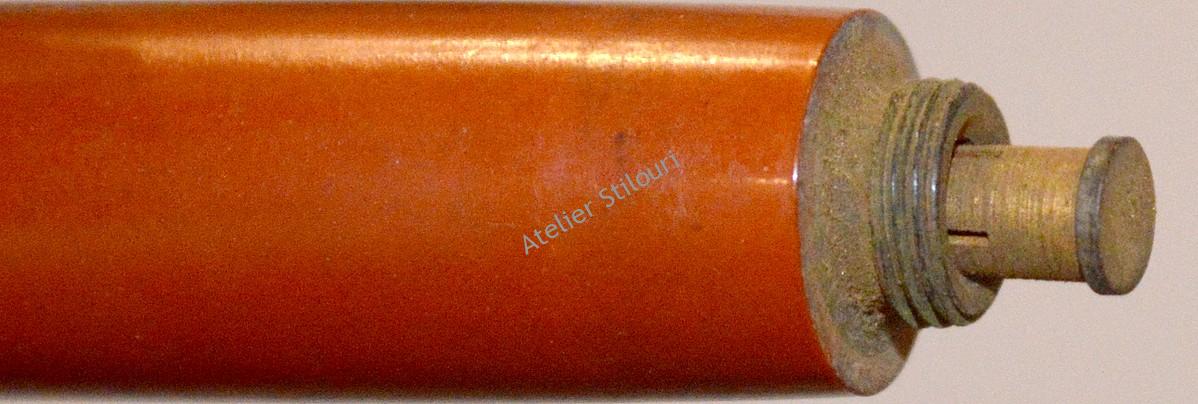 Stiloul a fost reparat/restaurat si este perfect functional, iar aspectul cosmetic a fost mult imbunatatit. Nuanta pe corp si capac era innegrita de mizeria acumulata in interior, intunecand materialul. Corpul si capacul au fost scufundate intr'o solutie de suprafata, care a inmuiat stratul de oxid depus pe material. Slefuire manuala si apoi mecanica a adus stiloul foarte aproape de culoarea originala.