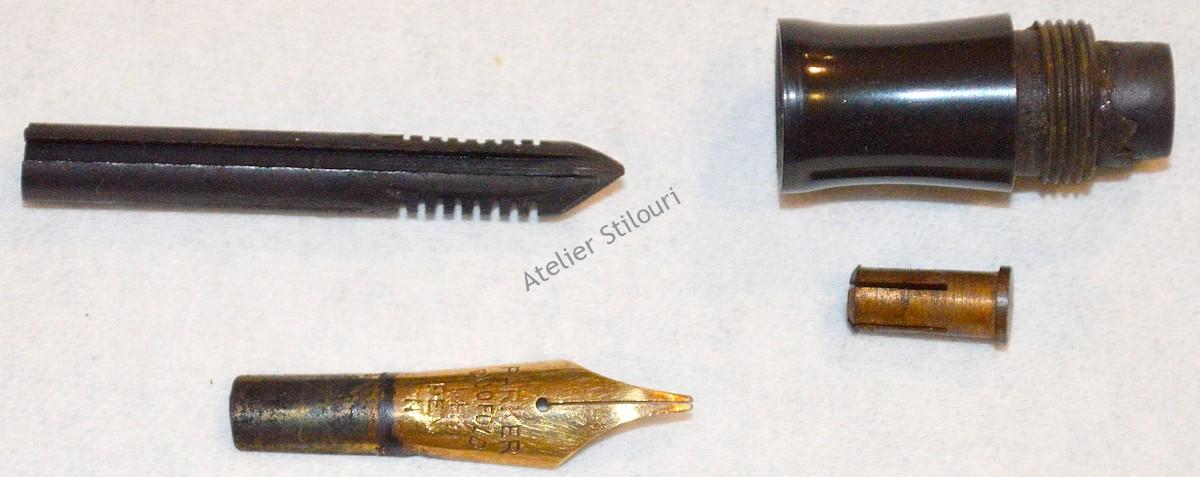 Cum era de asteptat, stiloul avea probleme multiple: sac pietrificat, lamela ruginita si rupta in interior, butonul blocat, mizerie cristalizata in interior peste tot, penita indoita si lovita aproape de intrarea in sectiune, feedul deformat, lipsa clip.