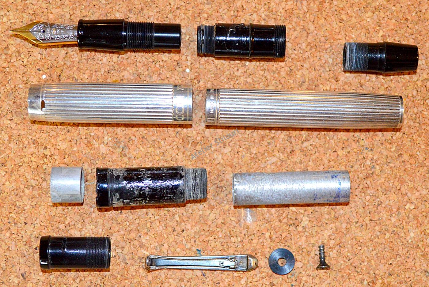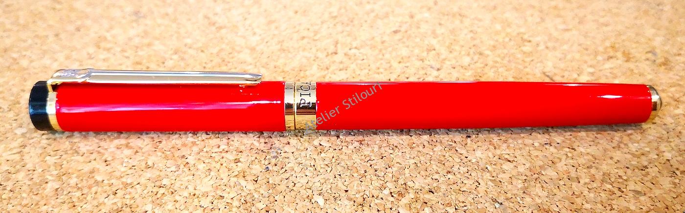 Bronz cu strat polimerizat de rosu lacuit, foarte bine facut. Lipsa plasticului in zona de insurubare face ca rezistenta stiloului sa fie extrem de buna. Incarcare cu c/c, model larg (2mm) la intrare pe sectiune. Furnituri bune, placate 24 kt, cu o penita excelenta, bine si frumos gravata.
