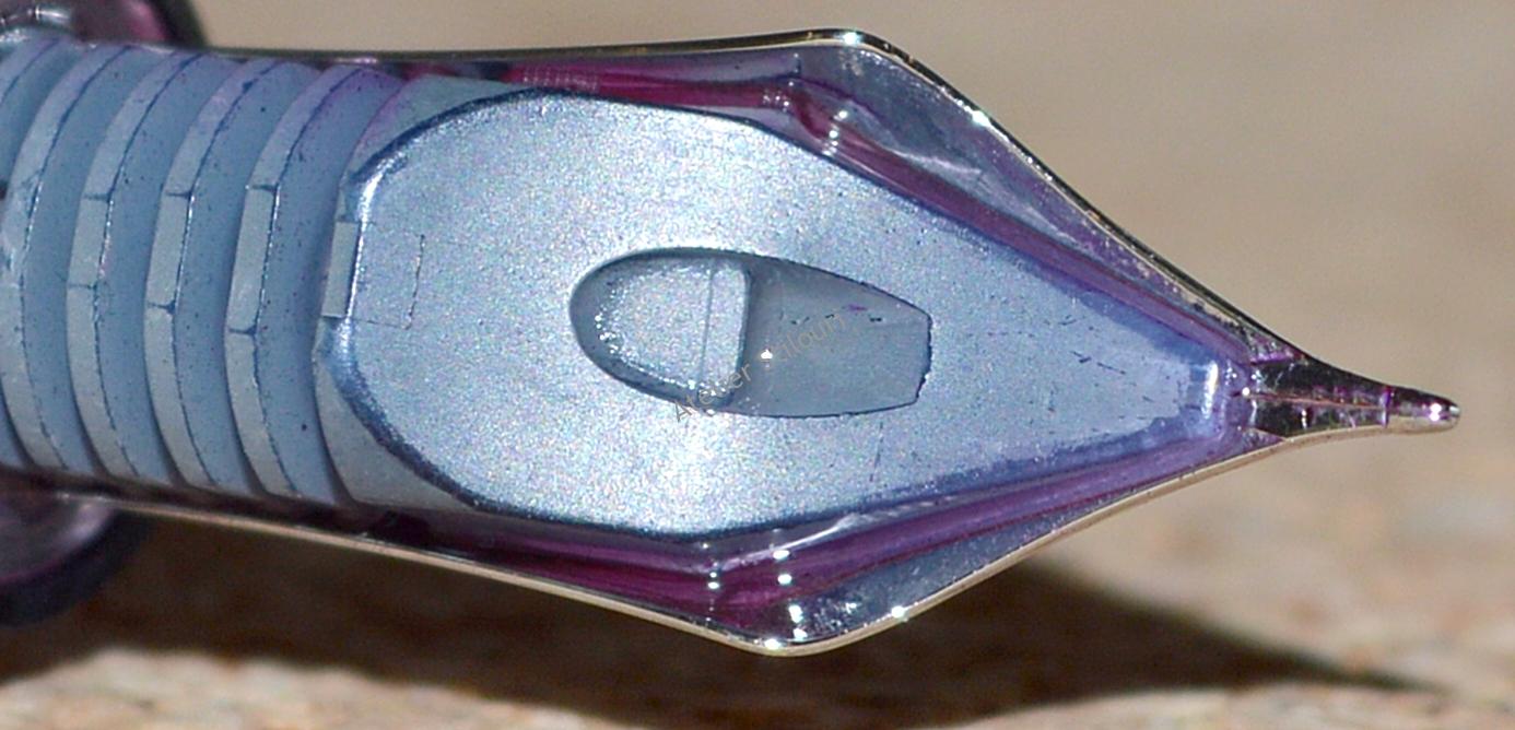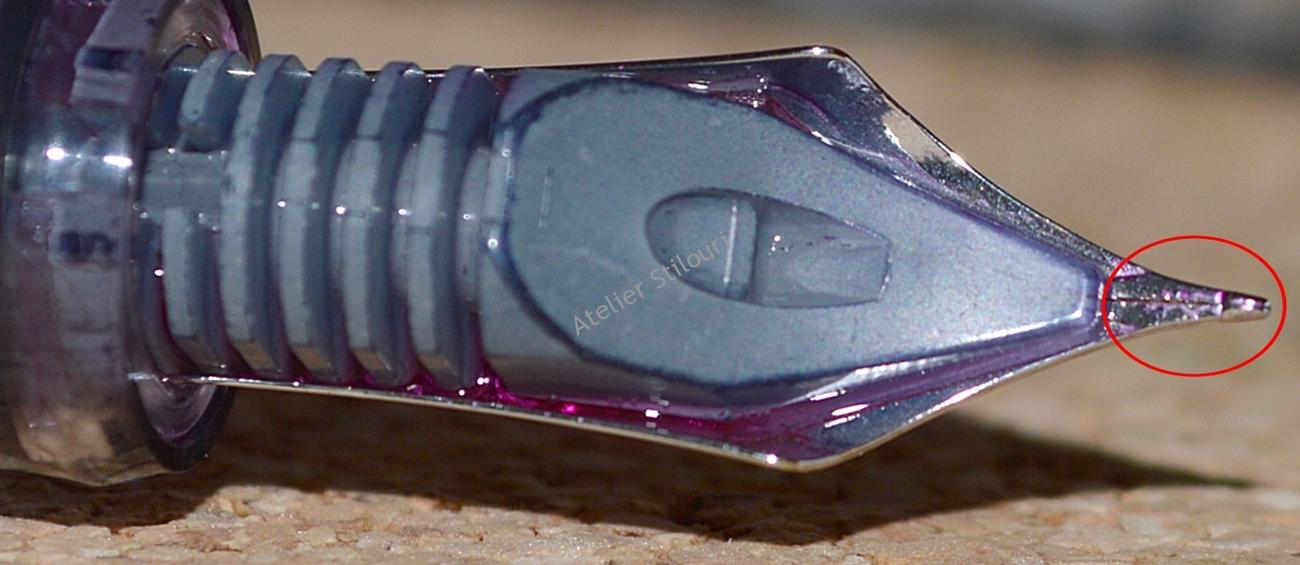 Din fotografii se vede ca cineva a intervenit pe penita, in spatele acesteia, pentru ca sunt urme de unealta acolo. Probabil ca a incercat sa largeasca sptiul dintre picioruse, (corect) intuind ca daca spatiul va fi mai mare, penita va avea un suport dublu de sprijin pe hartie si nu va mai avea acel feedback. Ce nu stia acel cineva este ca o astfel de ajustare nu se face asa, si in nici un caz avariind penita.