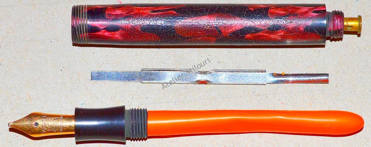 Instalat sac Orange Ultim8, lama interna noua, buton alama vintage. Instalat penita Parker stub, flexibila 2x, feedul a ramas. Deja culorile stiloului au devenit atragatoare, incepi sa vezi cum arata la inceput. Ramane capacul de rezolvat.