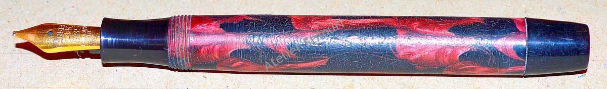 Curatat in interior si in exterior. Stratul fix de pe exterior este de fapt o manseta de caseina tratata termic, si din cauza umiditatii din anii care au trecut peste stilou, s'a crapat pe toata suprafata. Desigur, doar stratul lucios, nu si corpul. In acest caz nu se prea poate face nimic, pentru ca stratul respectiv nu poate fi reconstruit, micro-crapaturile de la suprafata nu au cum sa fie tratate.
