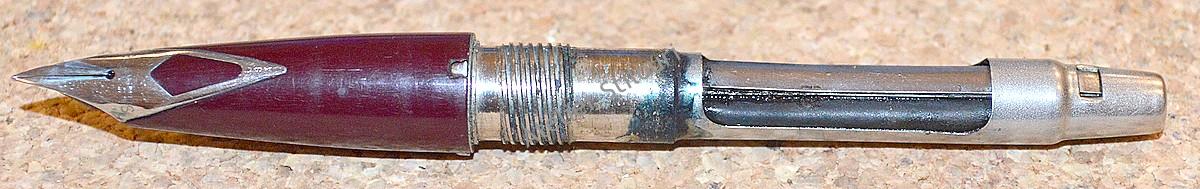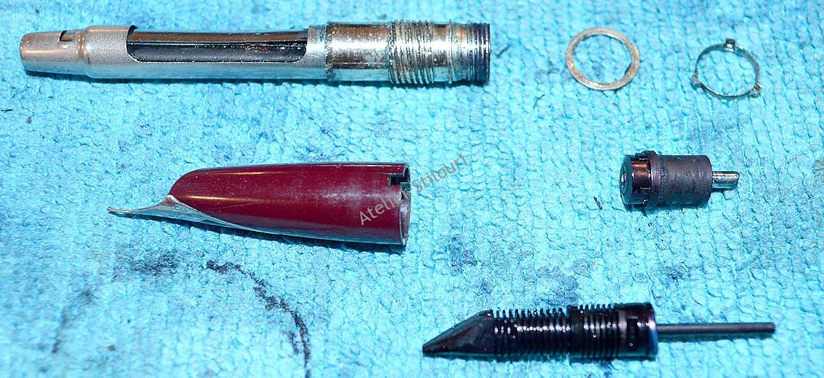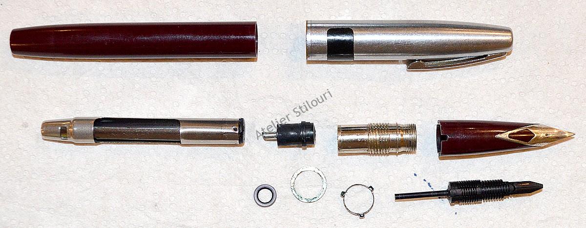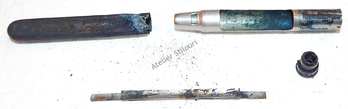 13/05/2021Un Sheaffer 440 Imperial, cu sistem de incarcare aerometric mobil (cartus aerometric). Venit intr'o stare precara, sac rupt in interiorul cartusului, cartusul prins cu adeziv pe conector, fisura sectiune penita, infundata toata partea de distributie a cernelii, zgarieturi adanci pe corp, depuneri serioase pe conector in interiorul sectiunii.