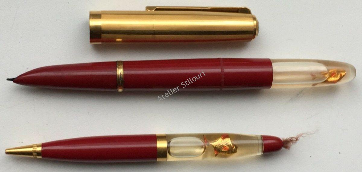 Set stilou si creion mecanic produs la Soyuz Leningrad, pe la 1975, din gama “Zolotaya Rybka”. Penita 14kt, accesorii placate.