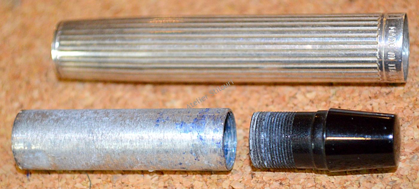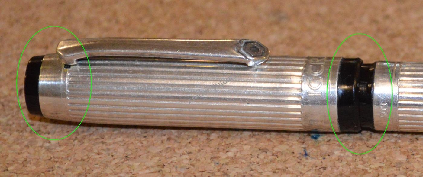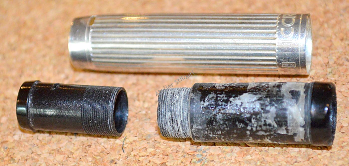 Sectiunea interna a capacului este afectata de adezivul folosit la fixare. Facuta prost, a lasat 2mm din sectiune inafara capacului, si astfel postarea pe stilou a dus la largirea gulerului, l’a zdrentuit si deformat. Partea cea mai proasta este ca filetul din interiorul sectiunii (care preia la inchidere corpul stiloului) a fost afectat rau, fiind aproape inutilizabil. Va trebui reconstruit un nou filet.