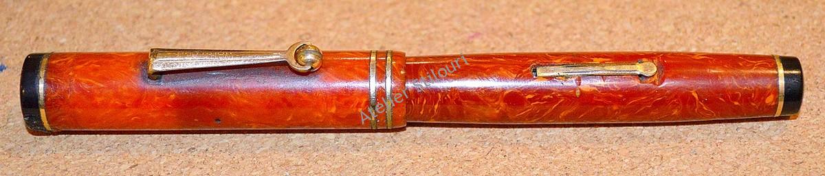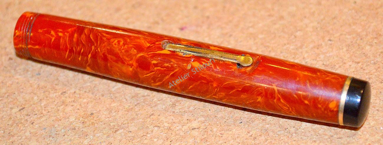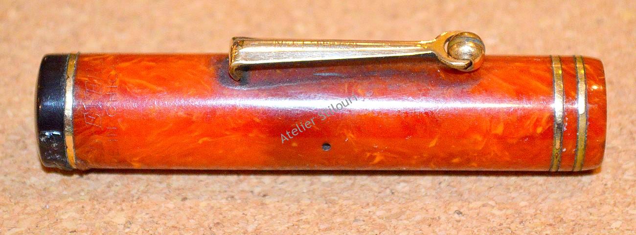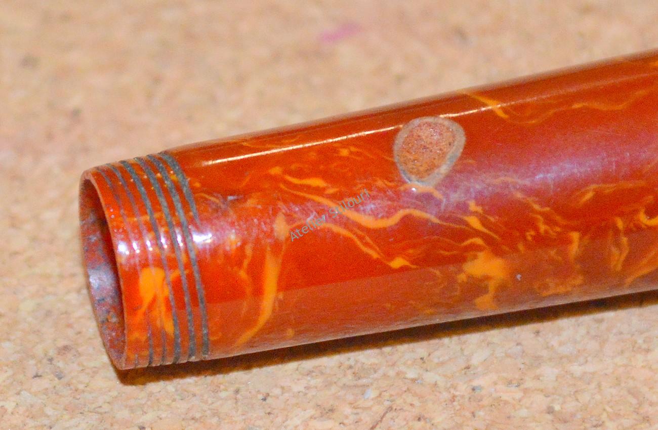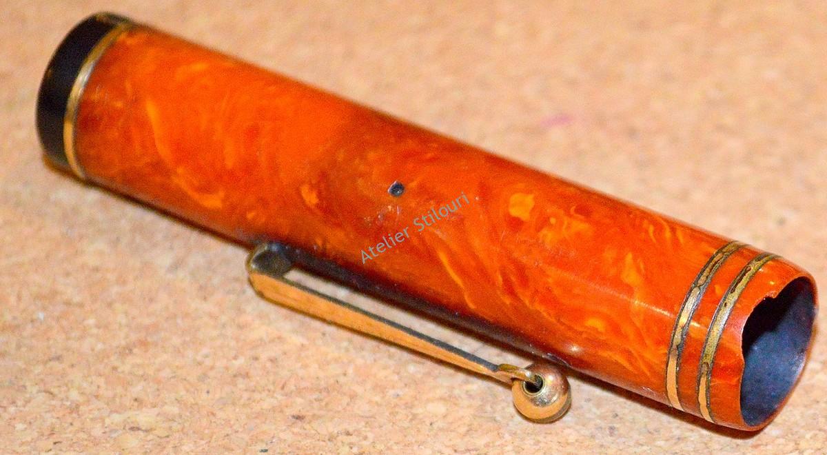 04/01/2020Un stilou extrem de frumos, Wahl Eversharp Coral Oversize (non-Gold Seal), fabricat prin 1925-1930. Este intr’o stare destul de buna, luand in consideratie ca a stat ceva ani intr’o cutie, facut bucati. Celuloidul nu este cristalizat, nu sunt fisuri sau crapaturi nicaieri. O pata de adeziv pe corp, sectiunea penitei are o fisura pe sac nipple. Capacul are lipsa 1.2mm din buza capacului, si o alta pata de adeziv pe butonul de varf. Ii lipsesc putine piese: penita, feedul, este murdar si cu celuloidul patat in cateva zone, toate astea se pot remedia.