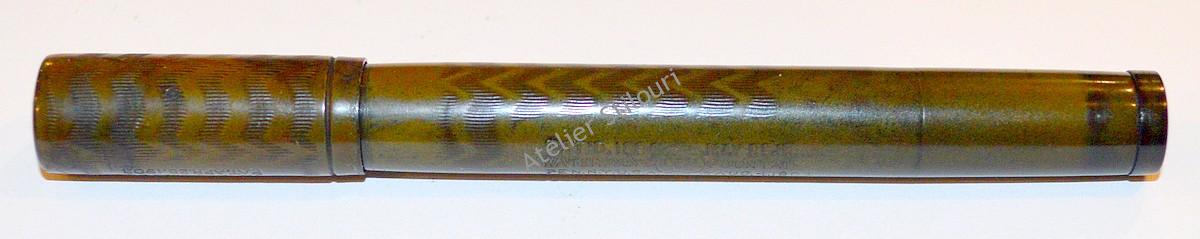 05/06/2021Waterman Safety no. 42, ebonita, sistem de incarcare pipeta (extern). Penita nu se blocheaza la extindere, spirala si pinul de ghidaj trebuie curatate, feed cu varf lipsa si penita asezata prea sus in sectiune, si cel mai important, garniturile din sectiunea de avans sunt complet compromise. In rest, un stilou foarte frumos, cu o vechime impresionanta in spate.