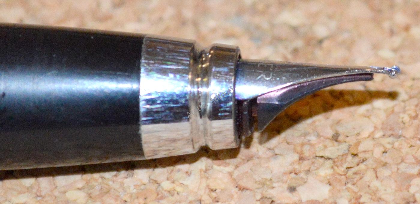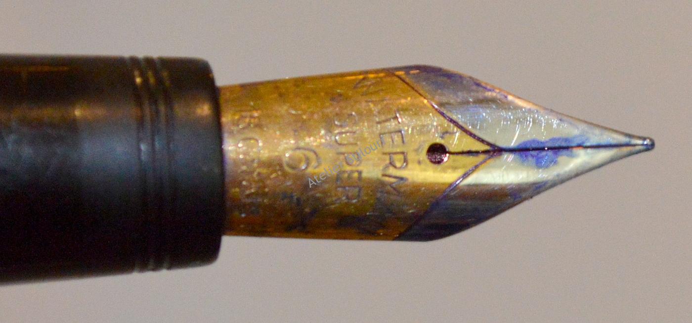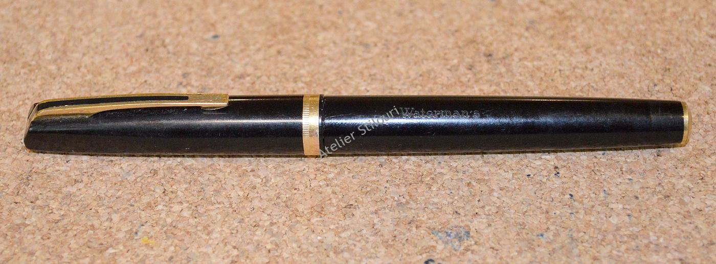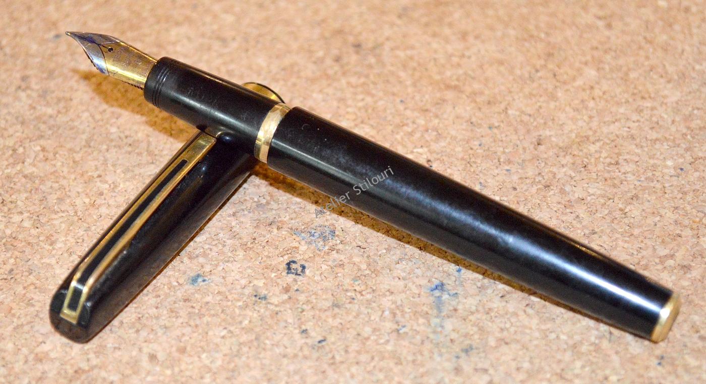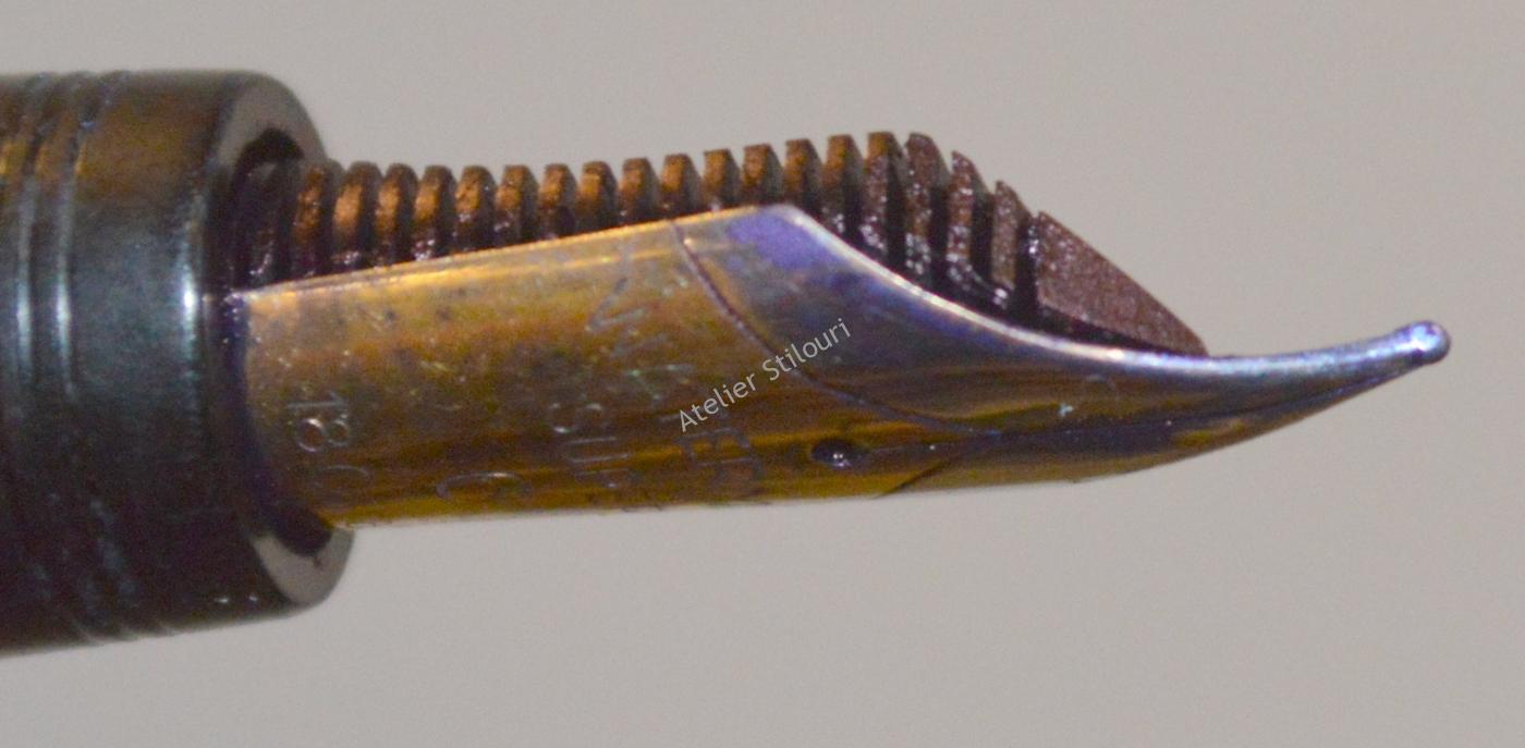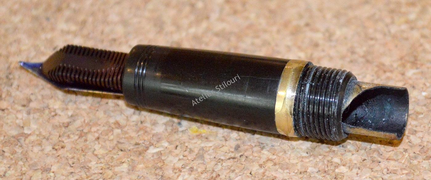 Acest stilou de aici este uzat, evident a fost folosit si folosit si folosit. Inca este functional (sort of), dar are nevoie de interventie: penita avariata, debit slab , port-cartus rupt, corp si capac oxidat/zgariat, feed incarcat. Si ca lista sa fie completa, capacul nu mai sta fix pe corp, a pierdut din inelul de frictiune, parte a defectului fiind indus si de pierderea placii de aur de pe inelul gripului, diametrul a scazut, frictiunea nu mai functioneaza.