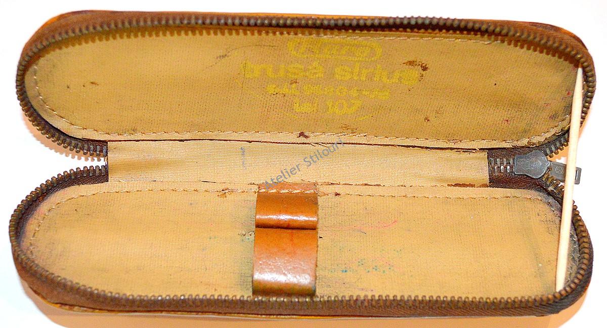 Acesta de aici mi'a fost vandut acum ceva ani de un senior de prin Craiova, fusese director la una din intreprinderile locale, inainte de 89; mi'a spus ca acest etui i'a fost confectionat de un mester de la UCECOOP in Craiova, prin anii 65. Probabil ca asa si este, etuiul prezinta urme de lucru manual pe el, si nu este gravat. Mesterul a facut o treaba foarte buna, si a fost inspirat folosind matase in interior, drept protectie. In felul asta, etuiul s'a pastrat extrem de bine pentru varsta lui.