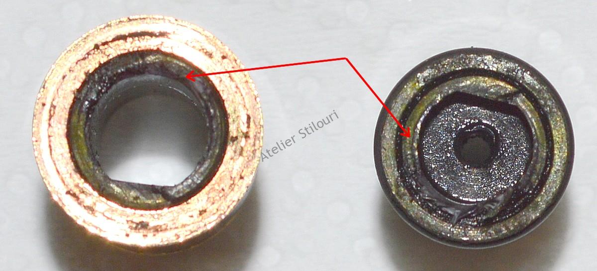 Dupa curatarea sumara a sectiunii, am gasit cauza scurgerilor de cerneala: forfecarea (ruperea) conectorului la imbinarea sectiune/port cartus. De aceea clientul avea probleme cu cerneala care se scurgea in zona dintre sectiune si corpul general. Practic, separatia era aproape completa, cele doua sectiuni ramanand in contact doar prin feedul care le tinea strans, trecand prin ambele sectiuni. Nu ar fi o problema sudura, insa in timp, unele bucatele din ruptura au disparut, ceea ce face mult mai grea sudura corecta si uniforma intre cele doua piese.