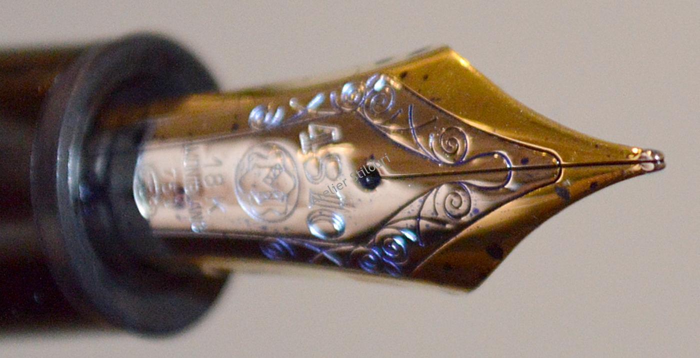 O penita excelenta, cu o forma ce o scoate in evidenta. Produsa in vreo 4 versiuni, aceasta penita de aici este confectionata din aur alb 14kt /585, si culoarea complimenteaza celelalte furnituri de pe stilou. Versiunea de aici este un OBB, cu caacteristici de stub italic. Are un flex surprinzator, se duce pana la 2x, dar nerecomandabil: oblicitatea unghiului de scriere face ca flexul sa nu functioneze exact ca la un stub normal. Dar ofera o variatie de linie interesanta si va recomand sa folositi cerneluri de nuanta vie (Iroshizuku, Herbin, Sailor, Diamine), pentru ca shadingul este unul prezent si placut ochiului.