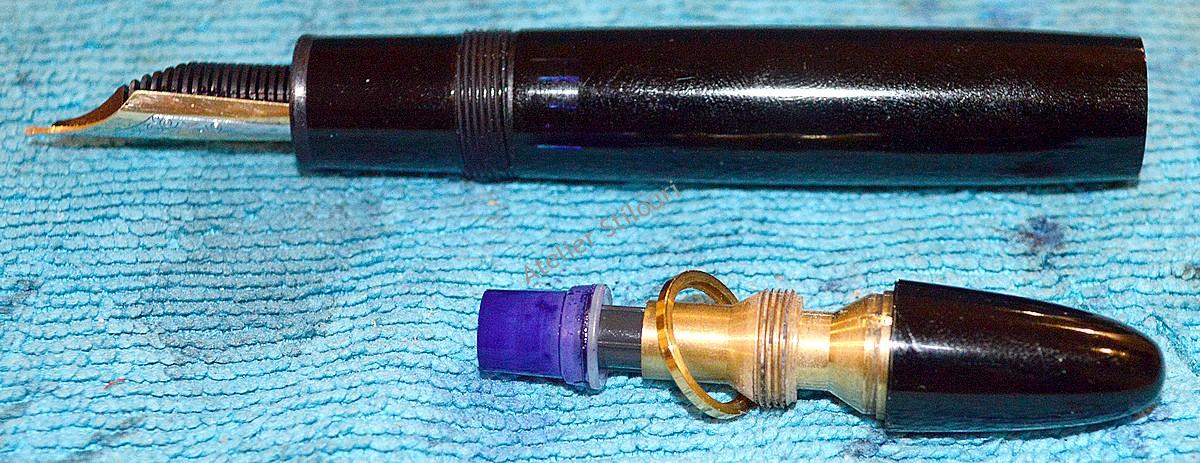 16/05/2021Venit in atelier pentru ca stiloul avea pistonul remontat de altcineva in mod defectuos, 1) gulerul decorativ era invers asezat (si nu retinea pistonul in mod corect), si 2) refiletarea in port a fost facuta fara se verifice daca filetul nu a fost incalecat cumva (si era). Rezultatul remontarii gresite a fost ca stiloul a scapat din filetul port-piston, si curgea bine mersi pe acolo, plus ca la avansare piston, butonul acestuia iesea din stilou cu tot cu portul pistonului.