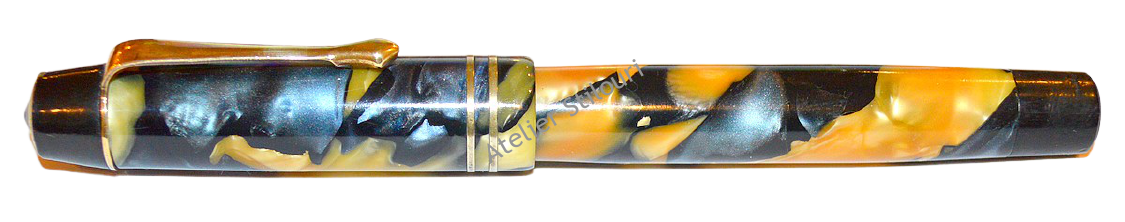Fabricat din foaie de celuloid in culori predominant gri-albastru-sidef-ambra, variatie de culori care se combina intr'un efect extrem de atragator. Furniturile (clip, inel tip jewel pe pastila retentie clip, si inel dublu pe capac) sunt alama placata 14kt, incarcare buton cu sac si lama normala. Sectiunea penitei, feed, capac fals buton si pastila clip sunt ebonita, bine tratata si inca lucioasa.