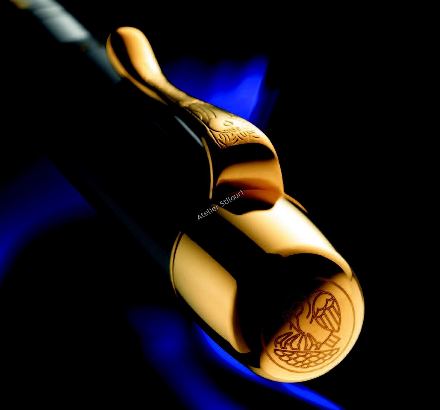 Penita este aur , gravata 18C-750 in linie medie; gravura este unica, designul este unic si el, doar pentru acest model de stilou, si include secventa “90 Years”, deasupra logo-ului cu 4 pui.
