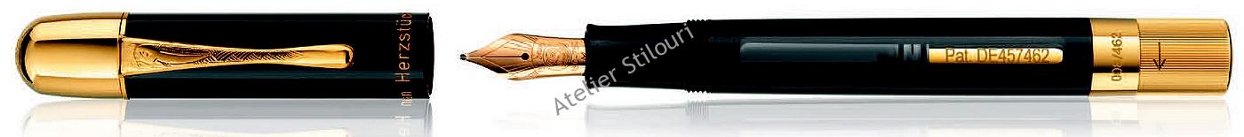 Ansamblul pistonului este gravat Pat. DE457462, un cod bazat pe numarul istoric al patentului. Capatul stiloului are sectiunea mobila din 18kt care poarta gravat numarul din serie a stiloului respectiv.