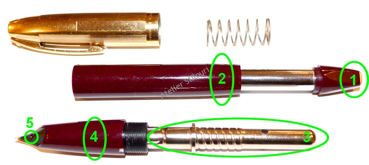 19/03/2021Introdus in 1959, modelul PFM (Pen For Men) de la Sheaffer a fost un eveniment ce a marcat designul si evolutia modelelor ulterioare din gama Snorkel / Touchdown. Acest stilou de aici a venit in atelier cu multiple probleme: garniturile 1 si 2 complet tocite, schimbarea sacului cu unul similar cu originalul (3), garnitura interioara de pe sectiune (4) si desfundarea feedului din tubul snorkel. In plus, penita este avariata si trebuie refacuta si aceasta.