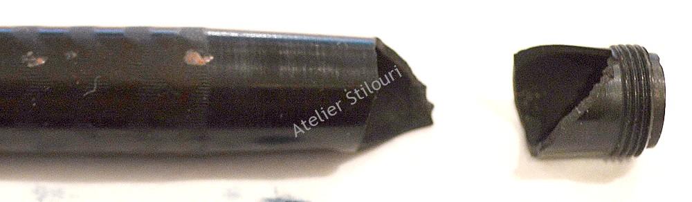 11/03/2023Stilou de tip "safety", venit in atelier cu manseta filetata rupta. Ebonita este un material extrem de dificil in ce priveste sudura, polimerizarea este de multe ori nerealizabila. Sa speram ca in acest caz va reusi, punctul de torsiune al piesei este chiar pe iinia rupturii.