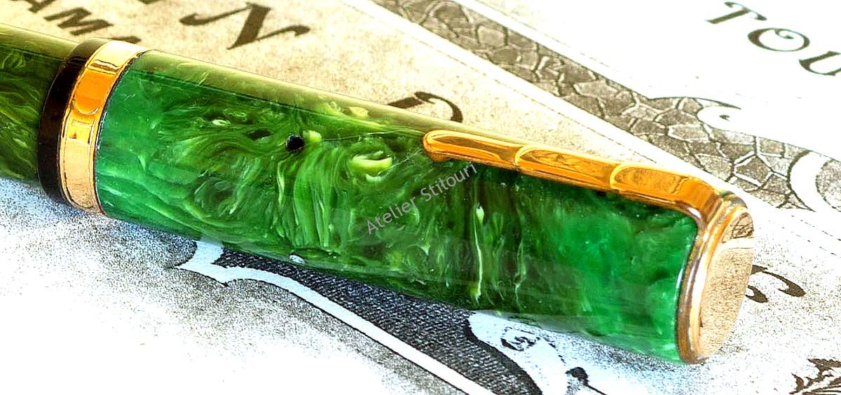 Stiloul a fost produs intr’o paleta relative interesanta de culori; acest model de aici este un model Jade (jad). Capatul capacului, clipul si inelul decorativ sunt placate cu aur in tehnica gold-fill. Penita este gravata “Waterman’s 14ct NW2”. Corpul poarta gravura “Waterman’s Fountain Pen – Made in Canada”. Dimensiunile sunt 105mm inchis, 140mm postat.