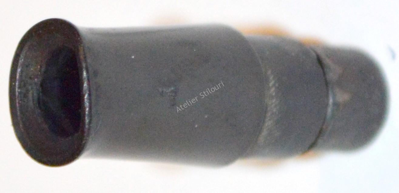 Acest stilou este avariat intr’o masura extrema: sectiunea penitei (ebonita) a fost deformata rau, probabil cineva a fortat scoaterea penitei, la caldura sau prin imersie in apa clocotita. Sectiunea a fost deformata din circular in oval, si face bineinteles imposibila montarea feedului si a penitei.